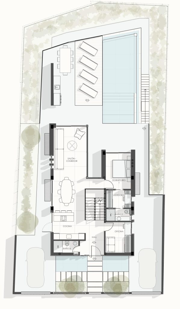 En el lado izquierdo de la planta baja se ubica la zona de día, con cocina, comedor y salón a doble altura, mientras que en el lado derecho se ubican un dormitorio y una oficina con sendos baños.